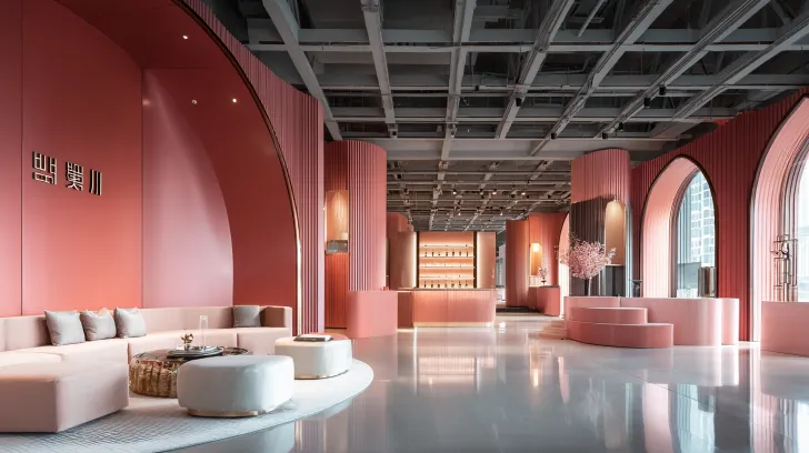 Midjourney Bot 更新时间:2026-02-10 00:11大厅。模仿电影大师库布里克风格,模仿电影《啦啦队长》。宫廷华丽风格,未来太空时代氛围。超大室内空间,服务台,自助窗口,造型柱子,楼梯,卡座,模块化亭子,水池,水上圆盘座位。造型吊顶。玫红色为主,淡粉色,金属,绒布 --ar 16:9 --v 7 --stylize 100