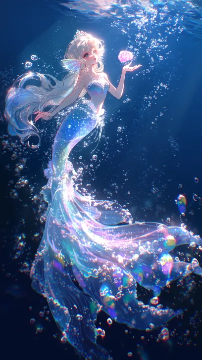 Midjourney Bot 更新时间:2026-02-10 00:14超写实电影感肖像,空灵银发美人鱼,东方美少女,成熟立体的小脸蛋,素描打底的绘画基础,在此基础上半厚涂融合先进CG技术,多元化融合女性精致漂亮的立绘,种族:美人鱼:皮肤白皙,微醺。清晰的侧脸,光追踪,HDR,头戴王冠,眼睛狭长(漂亮的瞳仁,狭长,微眯,浓密清晰的睫毛,芭比感的睫毛),白皮肤,细腻的白皮肤。眼波含媚、唇水润抿着。渐变雪色长发(无刘海后梳,微卷发尾,光泽感,根根分明,人鱼的全身图,竖立游动状态,巨大华丽的梦幻的冰蓝色人鱼尾巴,展现出惊艳美感的气质同时脸上带着羞涩神情。画面逆光效果,镜头模糊且极具颗粒、磨砂质感。手心向下,做出往上游的姿态,许多彩虹泡泡堆满画面,她身处于泡泡之中,一只手朝镜头方向伸出,从动态视角的仰视角度拍摄,背景是深海深渊之下神秘的墨蓝色海底世界梦核场,手上有个透明气泡,气泡里莹润的玫瑰花还在发亮,皮肤莹润珠光感皮肤,通透肤感,中式华丽繁复美学风格,先进CG技术,伪厚涂,半写实风格,材质纹理渲染+胶片颗粒细节,游动在清澈深海的高度写实上,身体露出海面,晨雾轻绕周身,明亮柔和侧逆光,轮廓光勾勒发丝与薄纱裙边,柔和漫射补光面部,通透朦胧发光氛围,浅景 ,中景全身构图,人物居中,微仰视角,天空地面留白均衡,动态线条引导视线,缓慢前行,身体微侧,双臂自然垂落,指尖微张,裙摆长发随风舒展柔和渐变过渡,鱼鳍金属肩饰镜面反光,鱼鳞,很多海底小鱼和水藻,水彩晕染渐变纹理,自然垂坠褶皱,银色镜面雕塑感肩甲,瓷白通透肌肤,高挺清晰鼻梁,锐利薄唇自然淡粉,细长灰蓝眼眸疏离凝视,锁骨淡细纹路,平静疏离表情,空灵圣洁疏离沉静,人间与天界的神话存在,超凡优雅淡淡悲悯,超精细刻画,8K分辨率,皮肤纹理逼真,背景柔焦,ArtStation热门风格,虚幻引擎5渲染,高级cg厚涂插画,半油画面部刻画,框架构图,现代女,高冷御姐,矜贵气质,发丝根根分明顺滑有气质,细腻刻画,五官精致立体,面部轮廓阴影,冷白细腻肌肤,水润质感,白皙皮肤,绝美桃花眼(正常大小),鹅蛋脸,睫毛卷翘自然,眼神慵懒无辜,轻欧美猫眼眼妆,眼部细节惊艳,聚光灯打在身上,攻击性的美,光影映射面部轮廓;精致淡妆,纤长卷翘睫毛,裸色清透唇妆,真人比例级五官,精致女王范柔和氛围感;刘海落下,脸颊一侧垂落自然碎发,随性精致;焦点集中于图中心内的人物;人物姿态随性慵懒,画面充满故事感,明暗对比强烈,形成鲜明的故事感图景 --ar 9:16 --c 14 --weird 25 --stylize 541 --niji 7 --no water