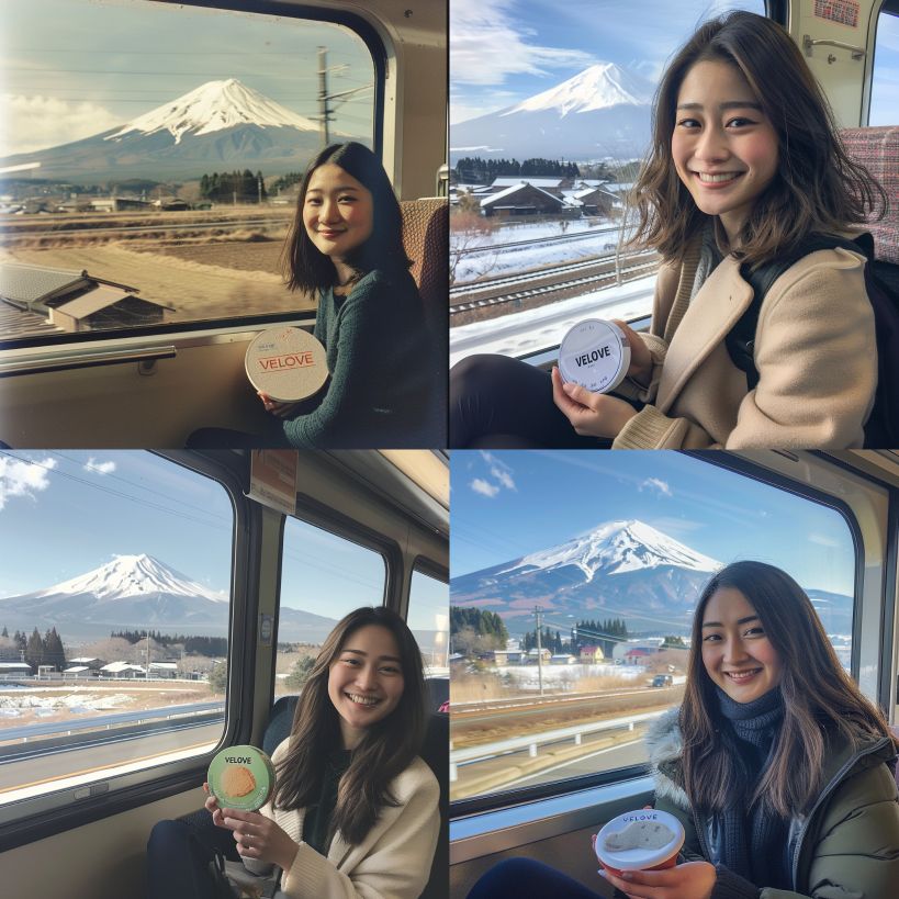 Midjourney Bot 更新时间:2024-05-03 00:06A young Chinese woman smiled at the camera, holding a circular box called "VELOVE" in her hand. She sat on the train seat and looked at the distant view of Mount Fuji from the train window. There was snow on top and some farmhouses in front of her. There is also a highway nearby that leads to Tokyo. This photo was taken by iPhone 15 Pro Max. This is a real photo- ar 4:3 --ar 1:1 --v 6.0