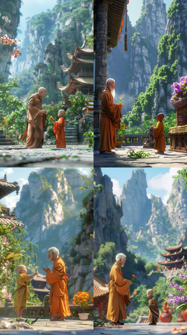 Midjourney Bot 更新时间:2024-05-04 00:003D model, cartoon character, old monk chatting with little monk in the temple courtyard. Surrounded by lush mountains, the old monk looks at the little monk, who picks a flower to offer to the old monk. In a 32k ultra high definition style, the scene is realistic --ar 9:16 --v 6.0