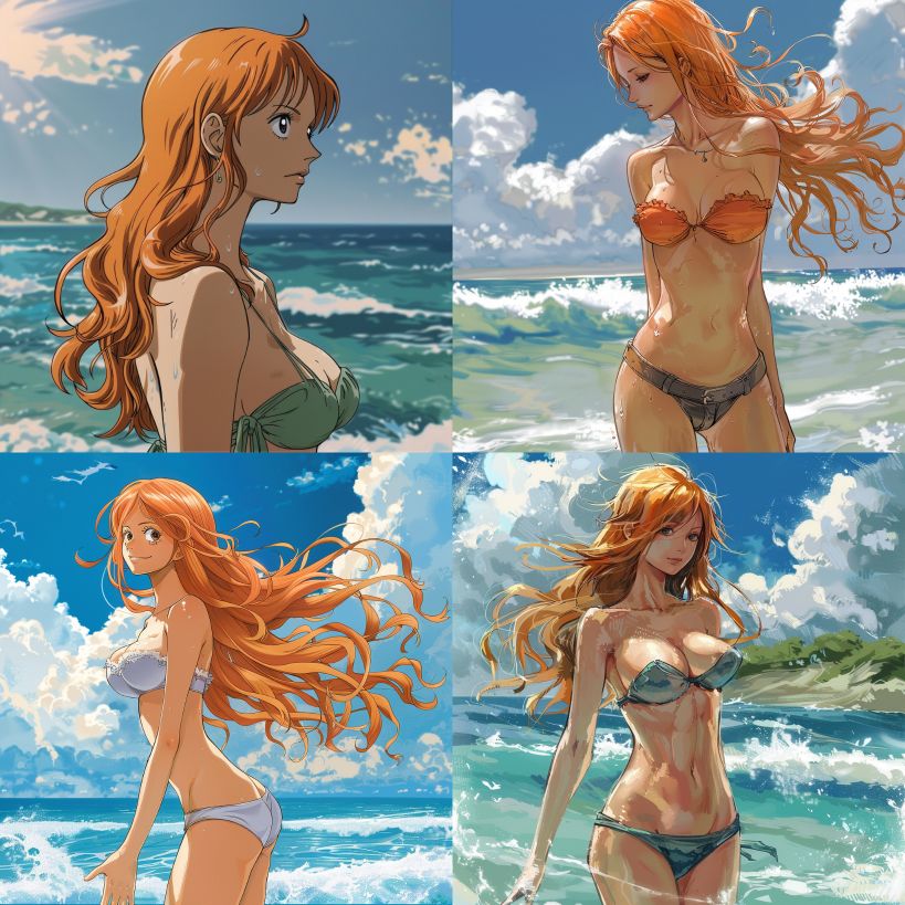 Midjourney Bot 更新时间:2024-04-25 00:00The character Nami in One Piece is by the sea, with long hair blown by the sea breeze and a slender figure --ar 1:1 --v 6.0